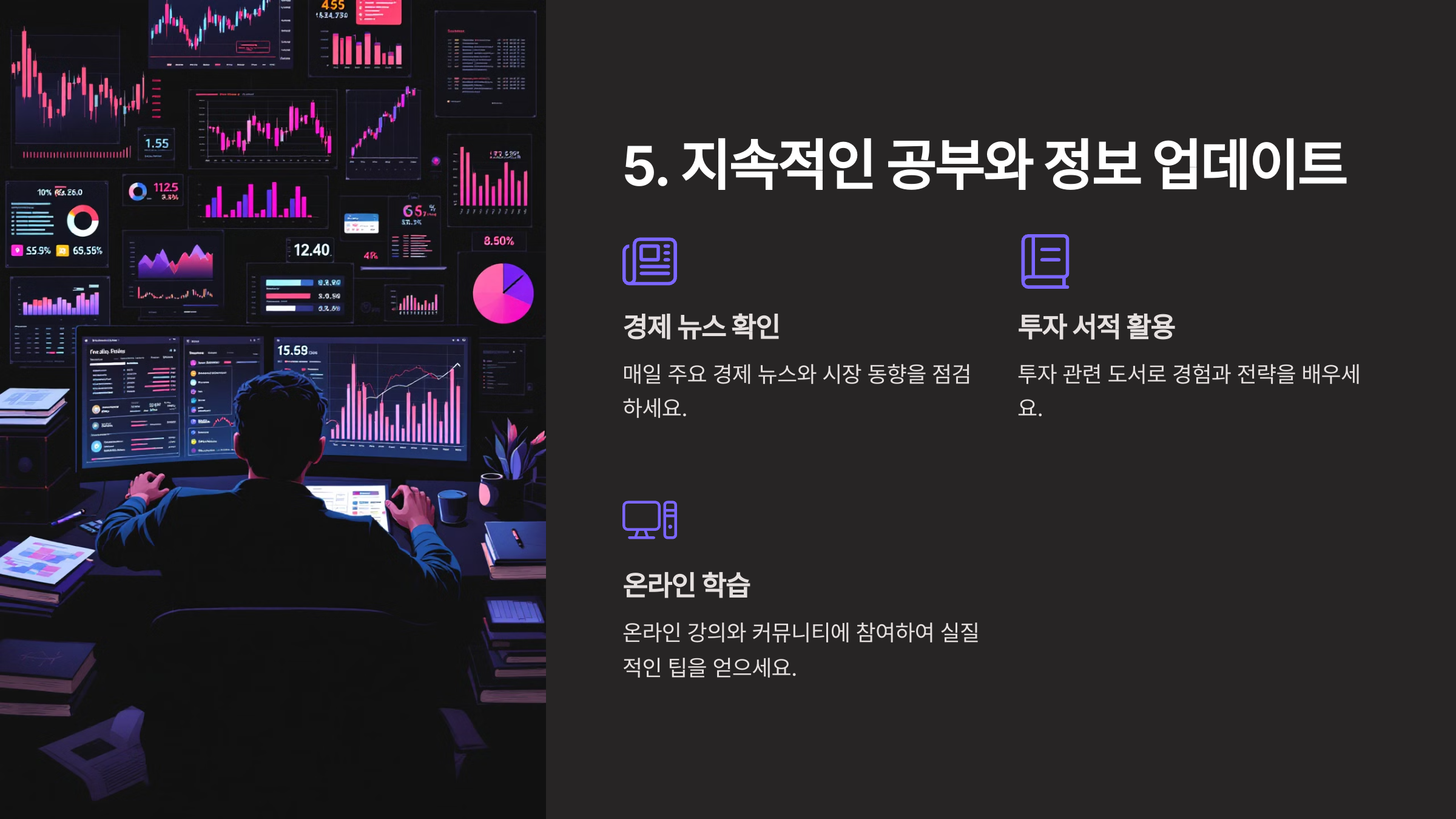 주식 시장에서 성공하려면 학습을 멈추지 않는 자세가 중요합니다. 시장은 끊임없이 변화하고, 새로운 트렌드와 기술이 등장합니다. 지속적인 학습과 정보 업데이트는 안정적인 수익을 내는 데 핵심적인 역할을 합니다.